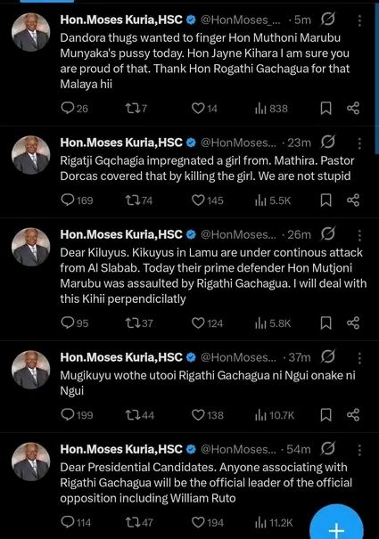 In a series of explosive social media posts that have ignited a political firestorm, Former Cabinet Secretary Moses Kuria has leveled grave allegations against Former Deputy President Rigathi Gachagua and his wife, Pastor Dorcas Rigathi.